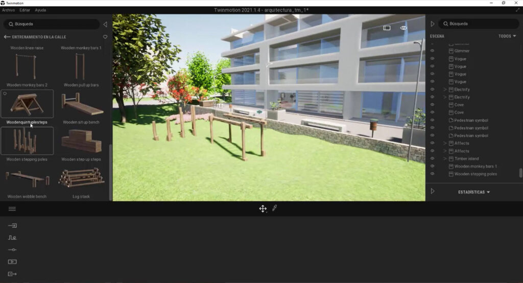 Aprende a agregar objetos de la biblioteca exterior de Twinmotion a tus escenas, incluyendo elementos como árboles, plantas, flores, mobiliario urbano, vehículos y otros objetos que enriquezcan el entorno exterior.