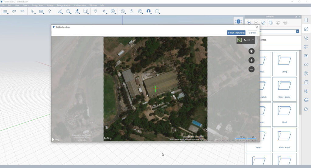 Aprende a importar la ubicación del proyecto en Formit, utilizando herramientas específicas para localizar el terreno y establecer la referencia geográfica.